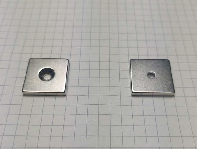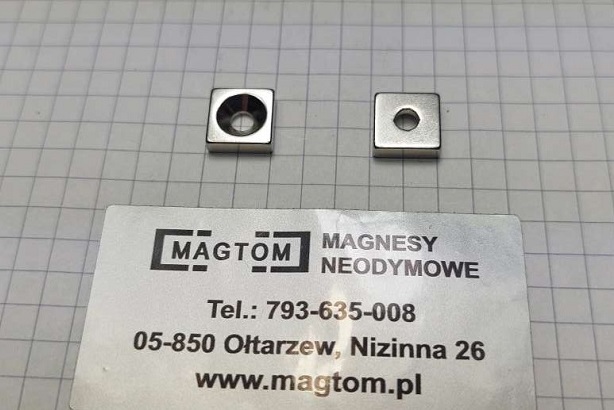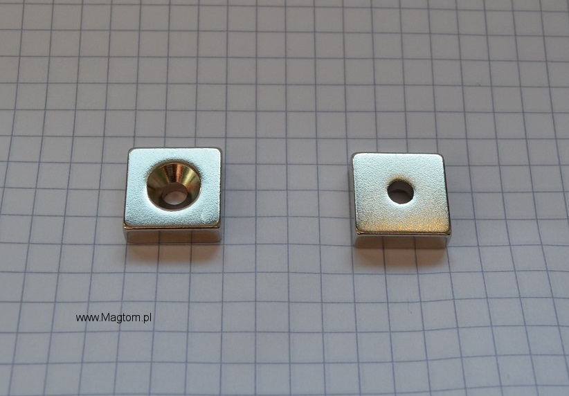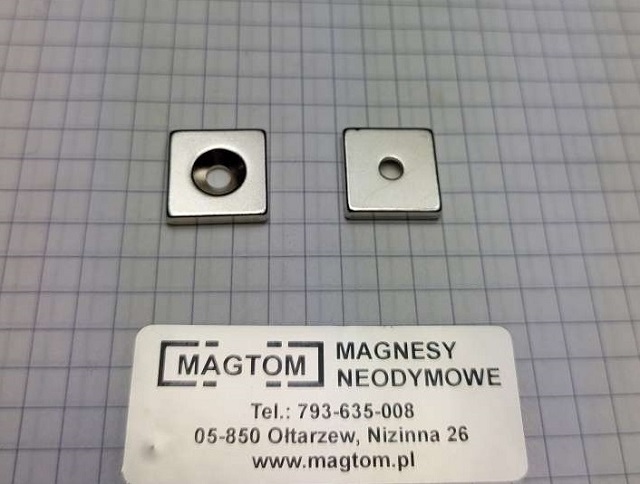 Magnes płytkowy pod wkręt MPŁW 20x20x5 [N38] stożek 8 mm do 4 mm biegun N lub S