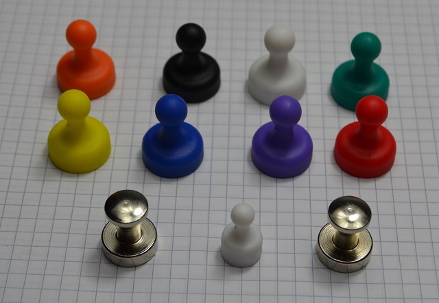 Kolorowe duże pionki plastikowe na tablice oraz stalowe duże pionki do tablic magnetycznych.